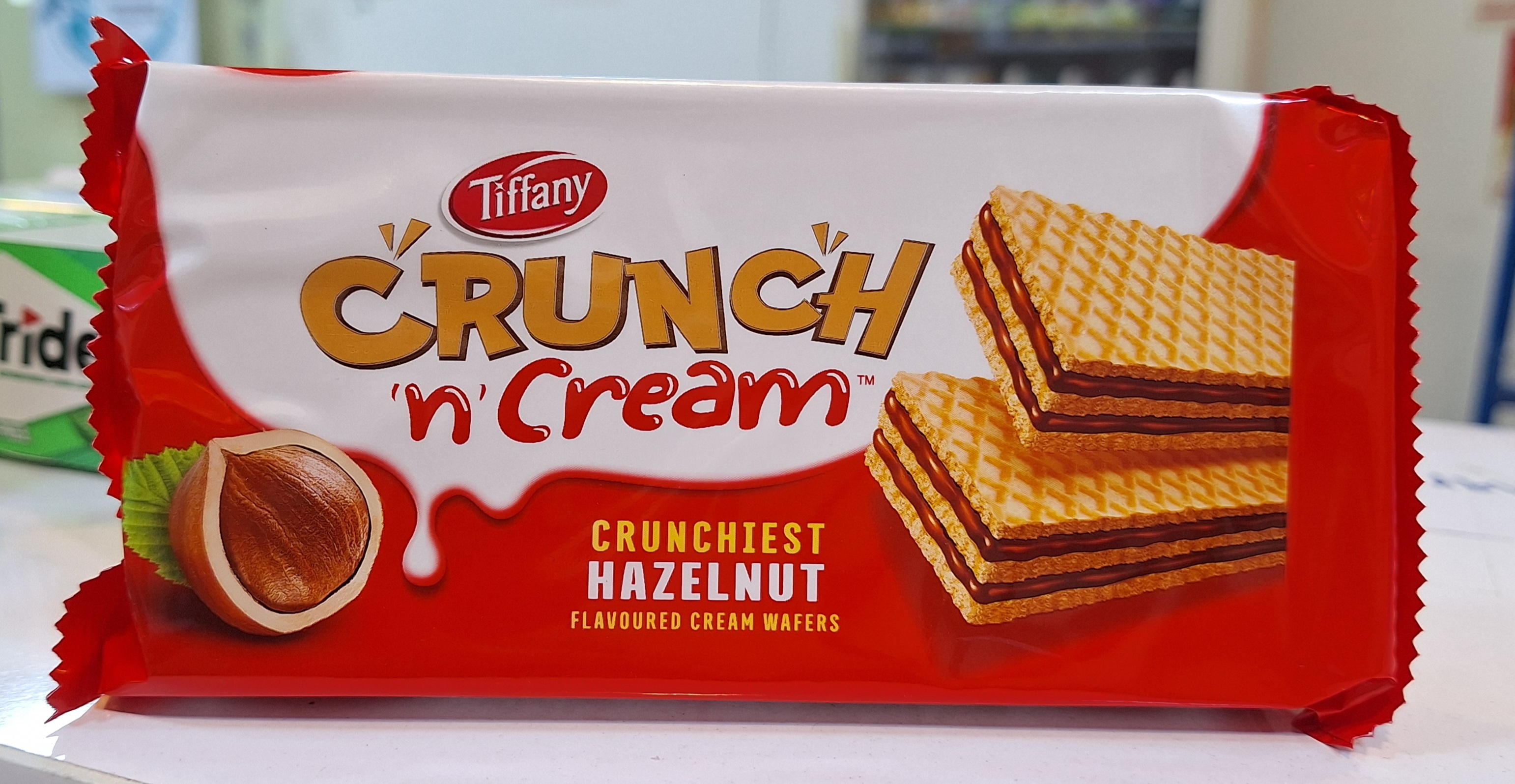 ویفر فندقی ۶۵ گرمی کرانچ تیفانی TIFFANY Crunch n Cream از محصولات پرطرفدار در میان ویفرهای کرانچ تیفانی است. ویفرهای فندقی همیشه از محبوب ترین ها بوده اند و شاید اولین محصولی باشند که هر تولید کننده ویفر در فکر اضافه کردن آن به فهرست تولیدات خود باشد. این محصول حاوی ویفرهای سه لایه ای است که مابین آن ها با کرم فندق درجه یکی پر شده است.