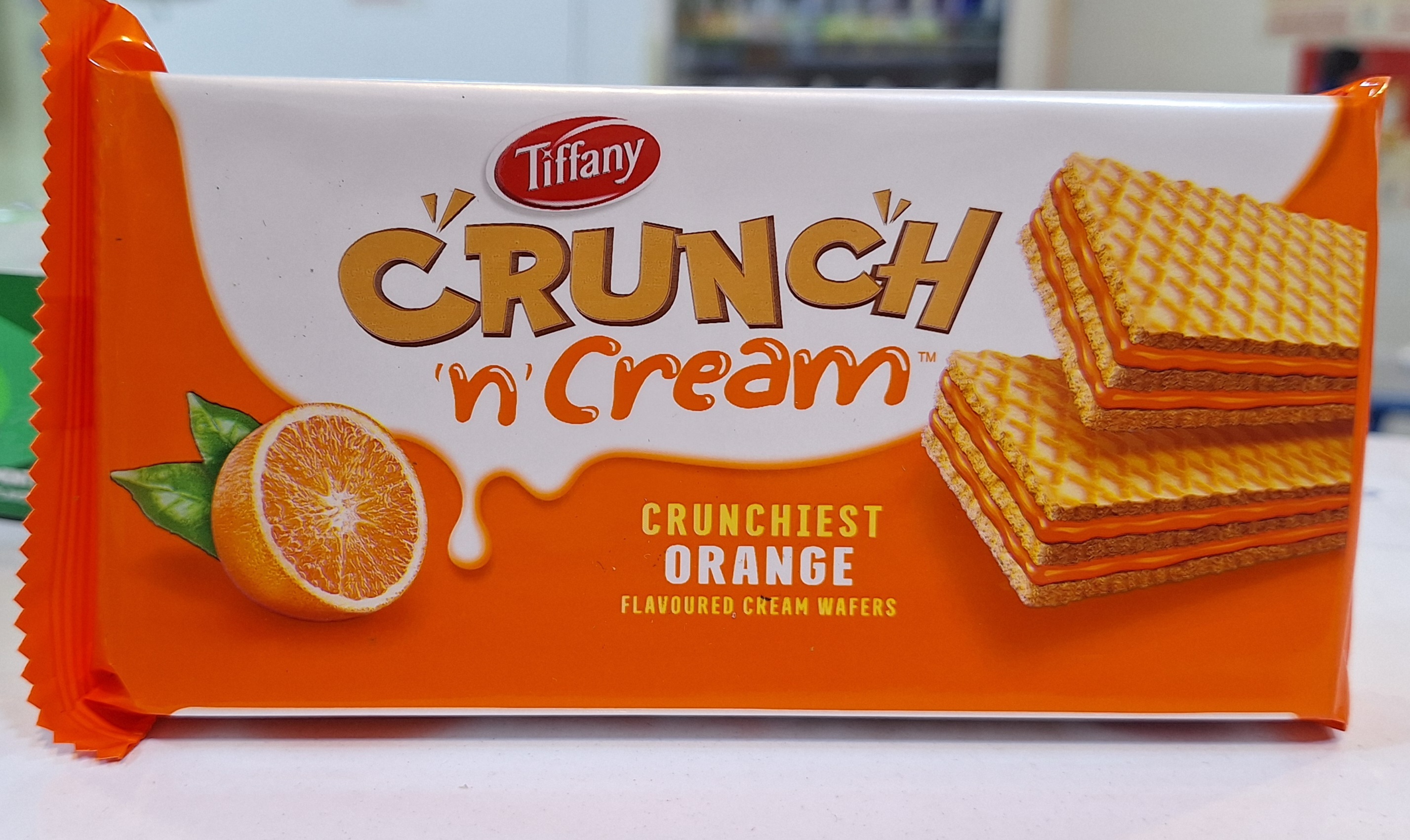 ویفر پرتغالی ۶۵ گرمی کرانچ تیفانی TIFFANY Crunch n Cream از محصولات پرطرفدار در میان ویفرهای کرانچ تیفانی است. ویفرهای پرتغالی همیشه از محبوب ترین ها بوده اند و شاید اولین محصولی باشند که هر تولید کننده ویفر در فکر اضافه کردن آن به فهرست تولیدات خود باشد. این محصول حاوی ویفرهای سه لایه ای است که مابین آن ها با کرم پرتغالی درجه یکی پر شده است. این کرم شکلاتی با استفاده از کاکائوی طبیعی و درجه یکی تهیه شده است. ویفرهای ترد، ظریف و با کیفیت در ترکیب با کرم پرتغال نرم و لطیف، بافت بسیار خوش آیندی را پدید آورده اند که به همراه طعم بی نظیر ویفر پرتغالی کرانچ تیفانی، مجموعه بسیار دلپذیر را می سازد. این ویفر، کیفیت بی نظیری دارد. اگر به دنبال طعم های آشنا ولی با کیفیتی متمایز از آن چه می شناسید باشید، این محصول پیشنهادی ویژه برای شماست. در کنار کیفیت خوراکی، بسته بندی محصول نیز زیبا و موفق است و علاوه بر کیفیت مناسب و توان بالا در محافظت از ویفر، جذابیت خود را نیز داراست.